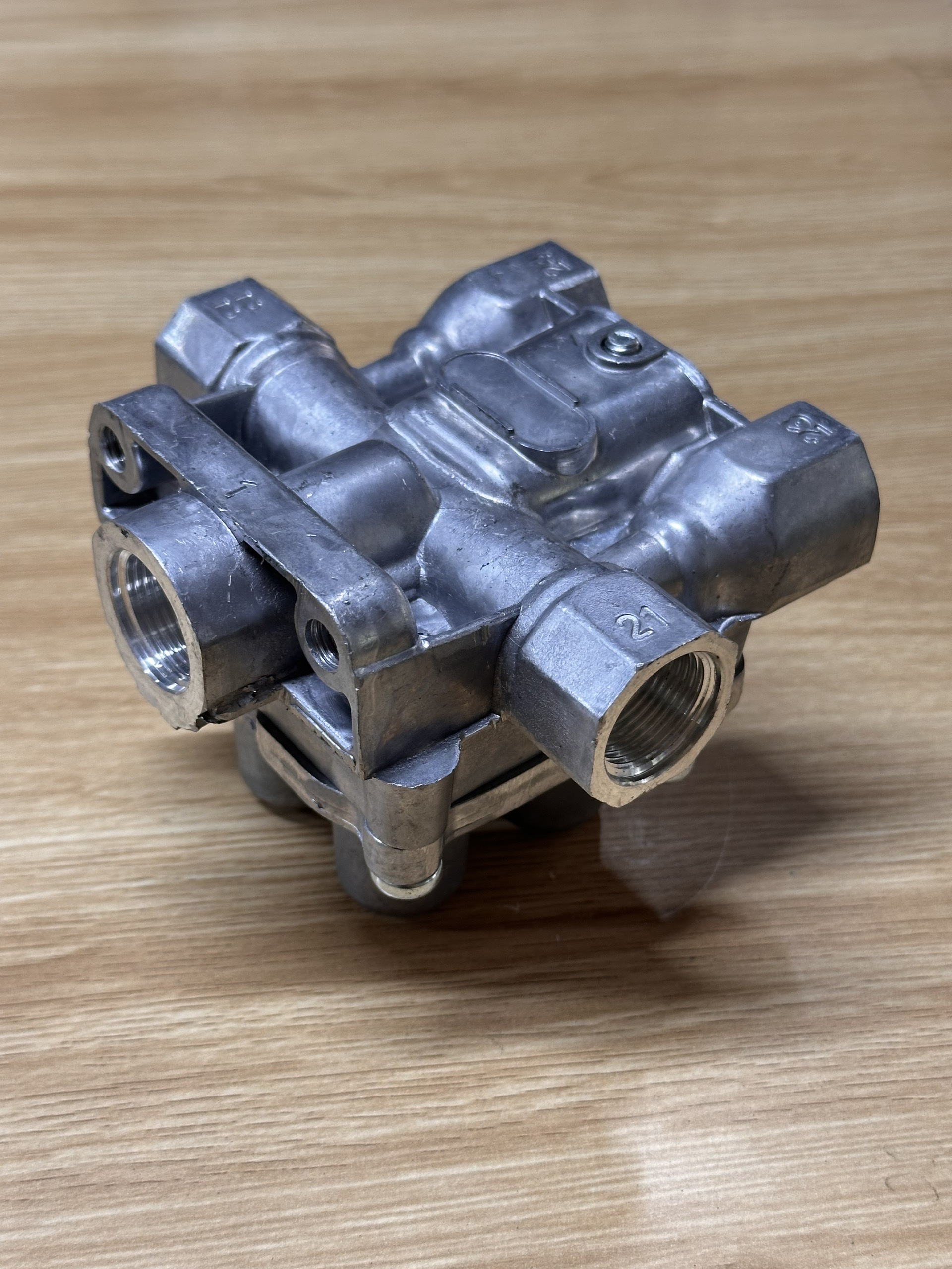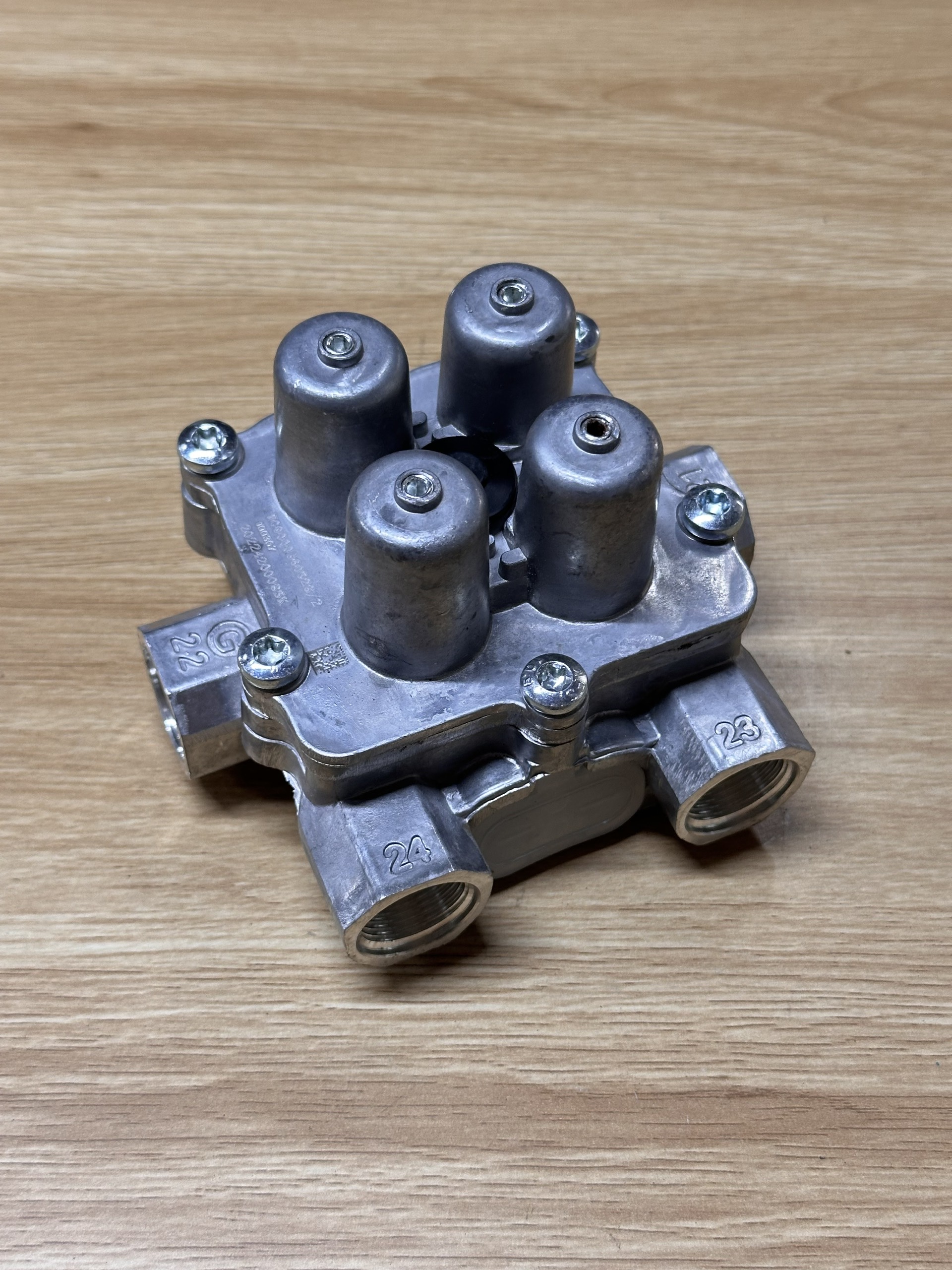 Chia hơi 4 núm (Van bảo vệ 4 ngả) lỗ M22 là phụ tùng “quốc dân” của các dòng xe Howo 371, 375 và A7. Điểm đặc biệt của loại này là cả 4 cổng ra đều dùng chung một cỡ ren M22 (phi 22), giúp bác dễ dàng mua cút nối mà không sợ nhầm.